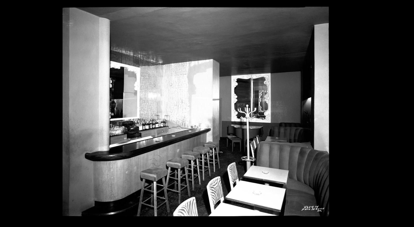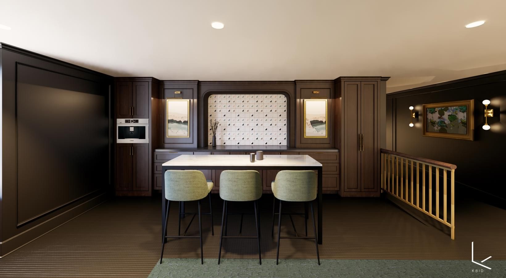 • a room with a bar and stools